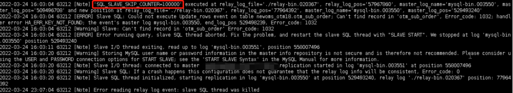 可以看到为了跳过报错的 SQL ,现场有手动设置过 SQL_SLAVE_SKIP_COUNTER=100000 ,表示跳过10万的 events ,而 binlog event 事件的多少,与事务表/非事务表、及 binlog 日志模式有关。