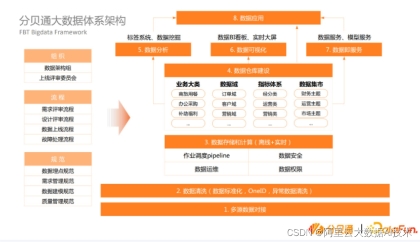 技术架构选型结束后,我们开始从内部梳理大数据建设的整体体系,逐步进行大数据建设。与大多数大数据体系架构类似,底层是多源数据连接,往上做数据清洗,再往上进行离线和实时的数据存储与计算,到数据仓库的建设,再到上面的应用层的建设,左边是组织流程规范的一些保障。