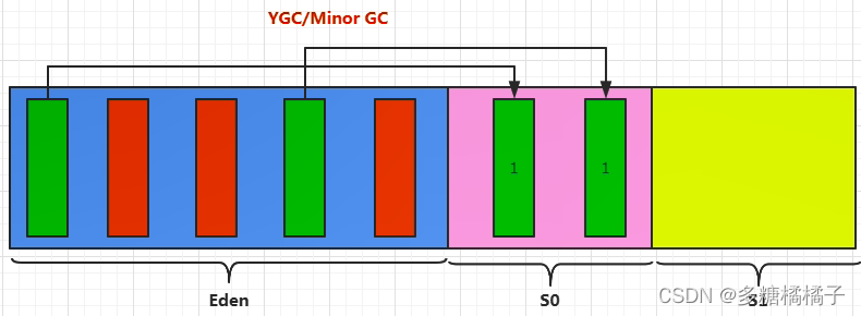 2、当我们进行一次垃圾收集后,红色的对象将会被回收(不再被使用,没有引用指向他),而绿色的还被使用着,存放在S0(Survivor From)区。