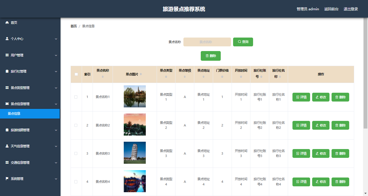管理员:首页,个人中心,用户管理,旅行社管理,景点类型管理,景点信息管理,旅游线路管理,天气信息管理,交通信息管理,系统管理等