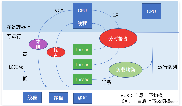on-CPU:执行中,执行中的时间通常又分为用户态时间user和系统态时间sys