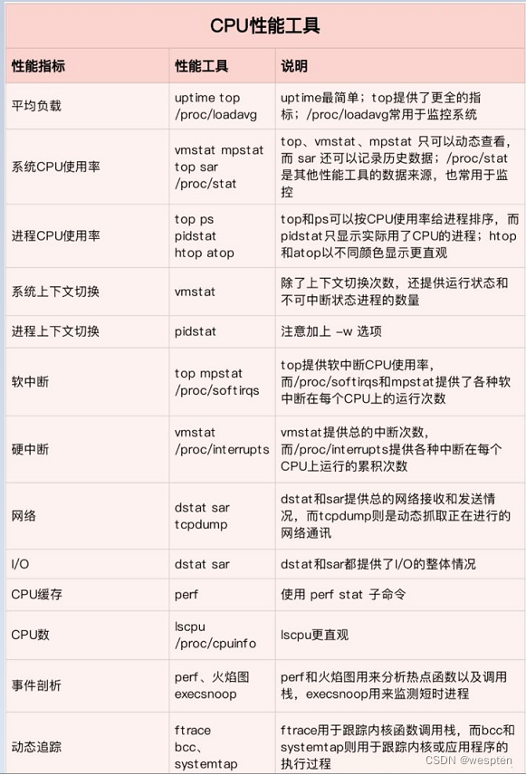 首先,从 CPU 的角度来说,主要的性能指标就是 CPU 的使用率、上下文切换以及 CPU Cache 的命中率等。下面这张图就列出了常见的 CPU 性能指标。