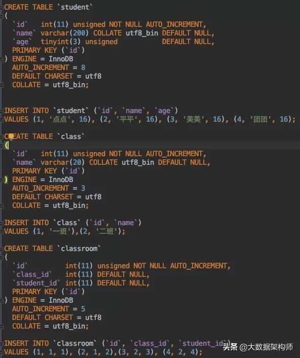 CREATE TABLE `student` ( `id` int(11) unsigned NOT NULL AUTO_INCREMENT, `name` varchar(200) COLLATE utf8_bin DEFAULT NULL, `age` tinyint(3) unsigned DEFAULT NULL, PRIMARY KEY (`id`)) ENGINE=InnoDB AUTO_INCREMENT=4 DEFAULT CHARSET=utf8 COLLATE=utf8_bin;