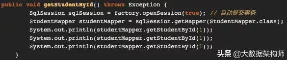 开启一级缓存,范围为会话级别,调用三次getStudentById,代码如下所示: