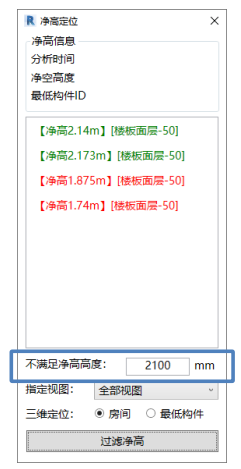 【不参与分析构件】排除净高不足X mm的构件,提高识别效率。