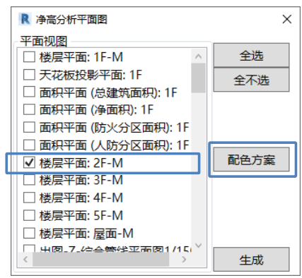 9.选择需要生成净高平面图的视图(使用【净高分析】后),以及设置配色方案。