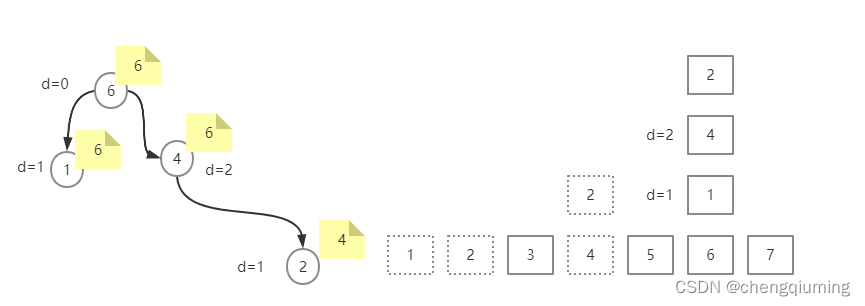 C 4 :查询 4 下面有多少个方块。首先查询 4 的集合号,在查询过程中将当前节点的集合号修改为其父节点的集合号,将当前节点的 d 值加上其父节点的 d 值,d[4]=d[4]+d[6]=2。