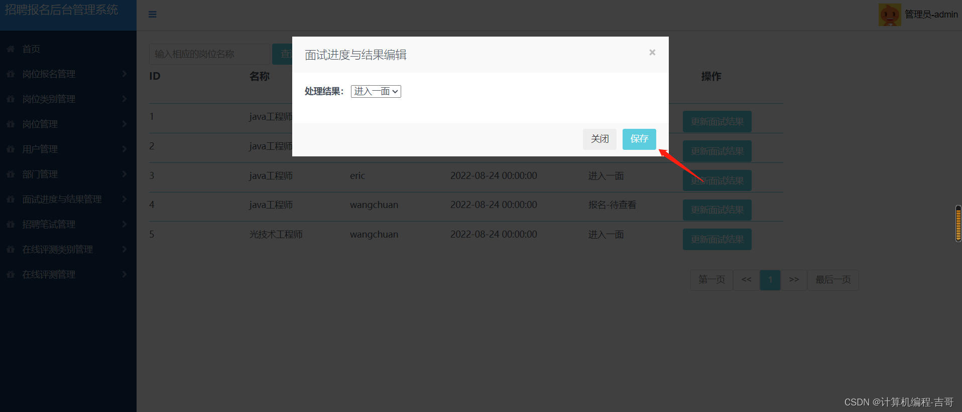 登录、首页、岗位报名管理、岗位类别管理、岗位管理、用户管理、部门管理、面试进度与结果管理、招聘笔试管理、在线评测类别管理、在线评测管理