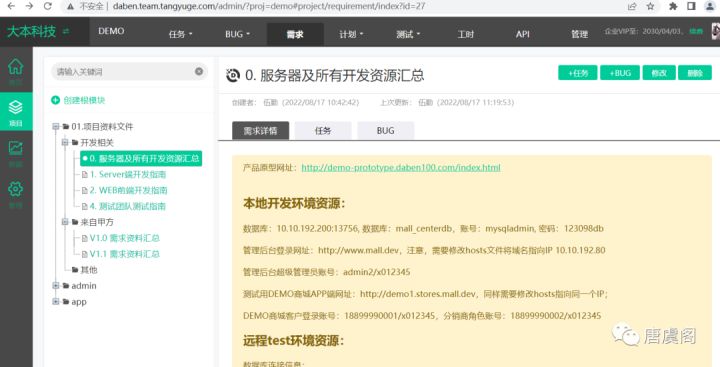 除了需求文档,项目开发资源其实也应该管理到一起,比如服务器资源、账号、开发指南,等等等等。如下图: