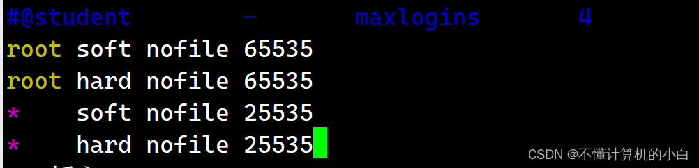 nofile:指限制的是文件数的配置项。后面的数字即设定的值,一般设置10000左右