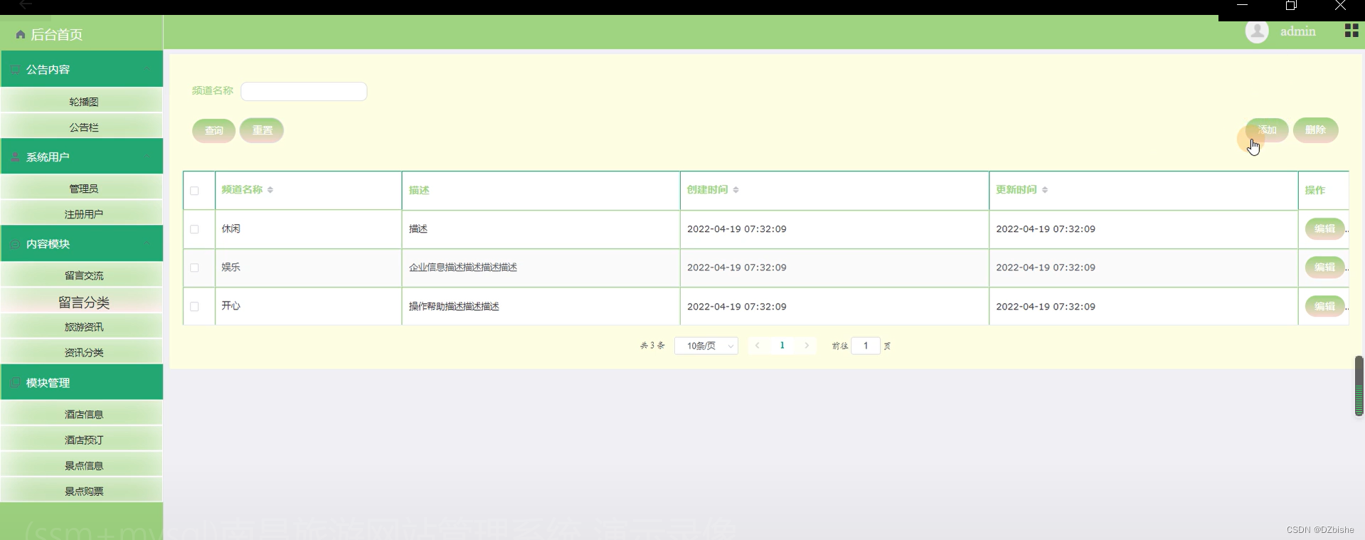 3、功能的完善性:可以管理首页、公告内容(轮播图、公告栏)系统用户(管理员、学生用户)内容管理(留言交流、留言分类、旅游资讯、资讯分类)模块管理(酒店信息、酒店预定、景点信息、景点购票)模块的修改和维护操作。