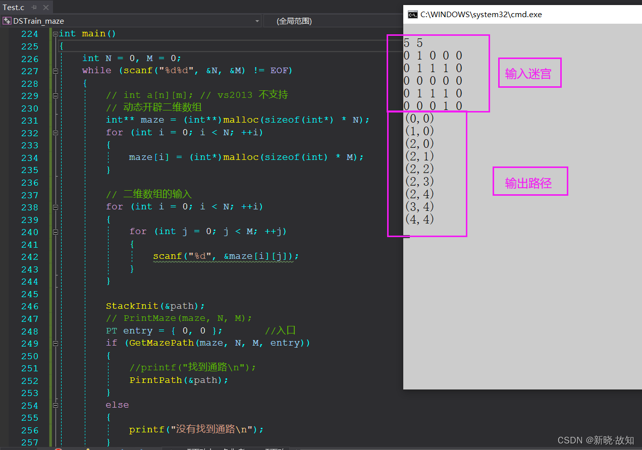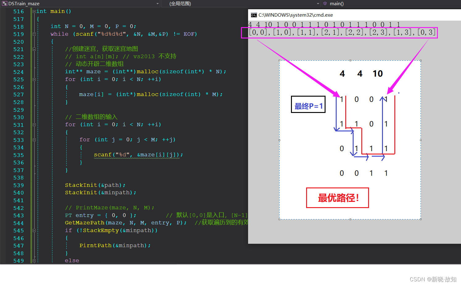 通过迷宫问题及最短路径问题,借助深度优先遍历(DFS)和回溯法求解,这里涉及到四路递归(上、下、左、右四个方向的递归),然而解决方法是一方面,解决工具也是另一方面。这里采用C语言实现求解,借助数据结构中栈的性质,实现深度遍历过程中的数据存储,然后回溯。使用C语言,涉及到二维数组的操作,这里使用了二级指针和指针数组,而在最短路径的比较更新中,涉及到了深浅拷贝问题,这里也需要注意,否则程序将会崩溃!