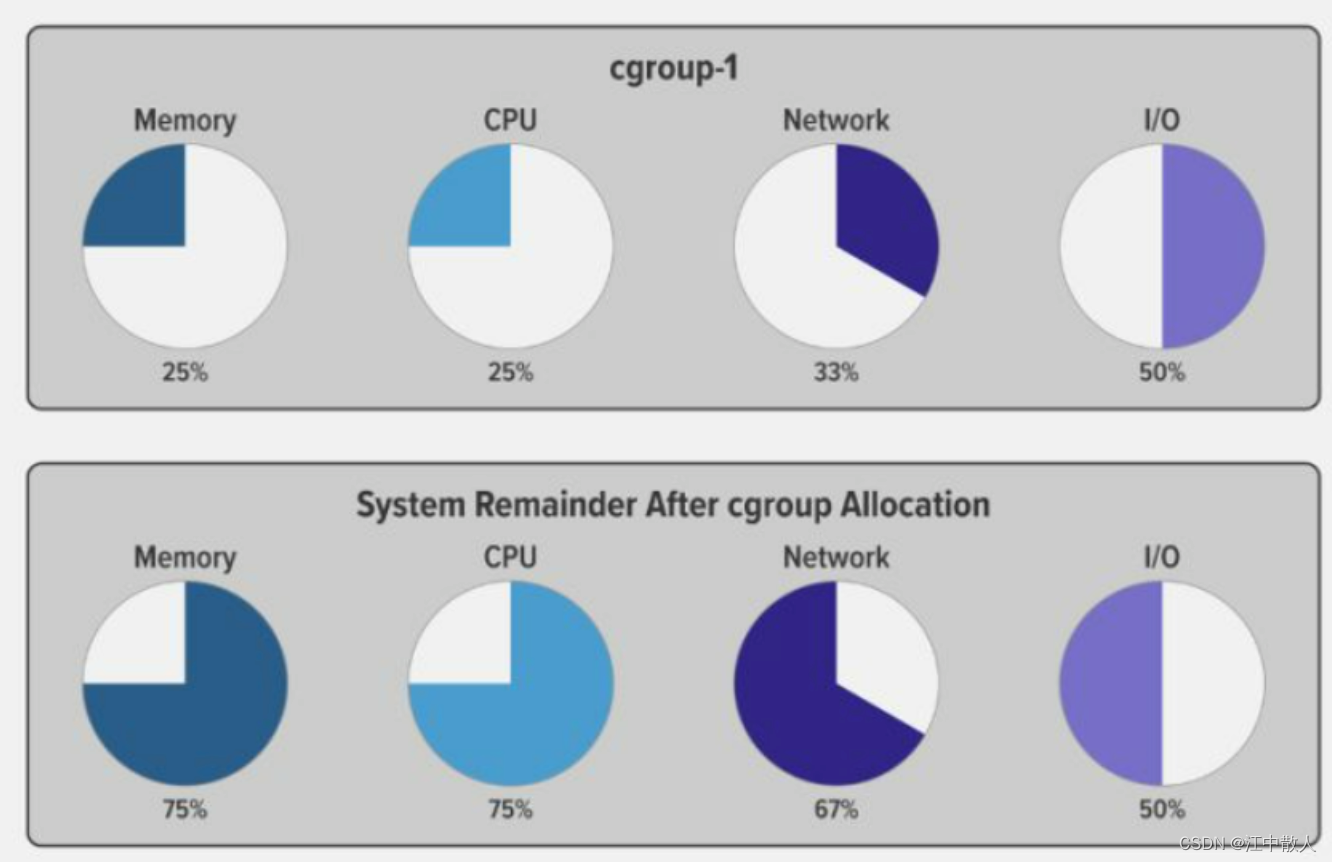 cgroups全称是control groups,是 Linux 内核的一个功能,用来限制、控制与分离一个进程组的资源(如CPU、内存、磁盘输入输出等)。它是由 Google 的两位工程师进行开发的,自 2008 年 1 月正式发布的 Linux 内核 v2.6.24 开始提供此能力。cgroups 到目前为止,有两个大版本, cgroup v1 和 v2 。cgroup 主要限制的资源是、CPU、内存、网络、磁盘 I/O。当我们将可用系统资源按特定百分比分配给 cgroup 时,剩余的资源可供系统上的其他 cgroup 或其他进程使用。