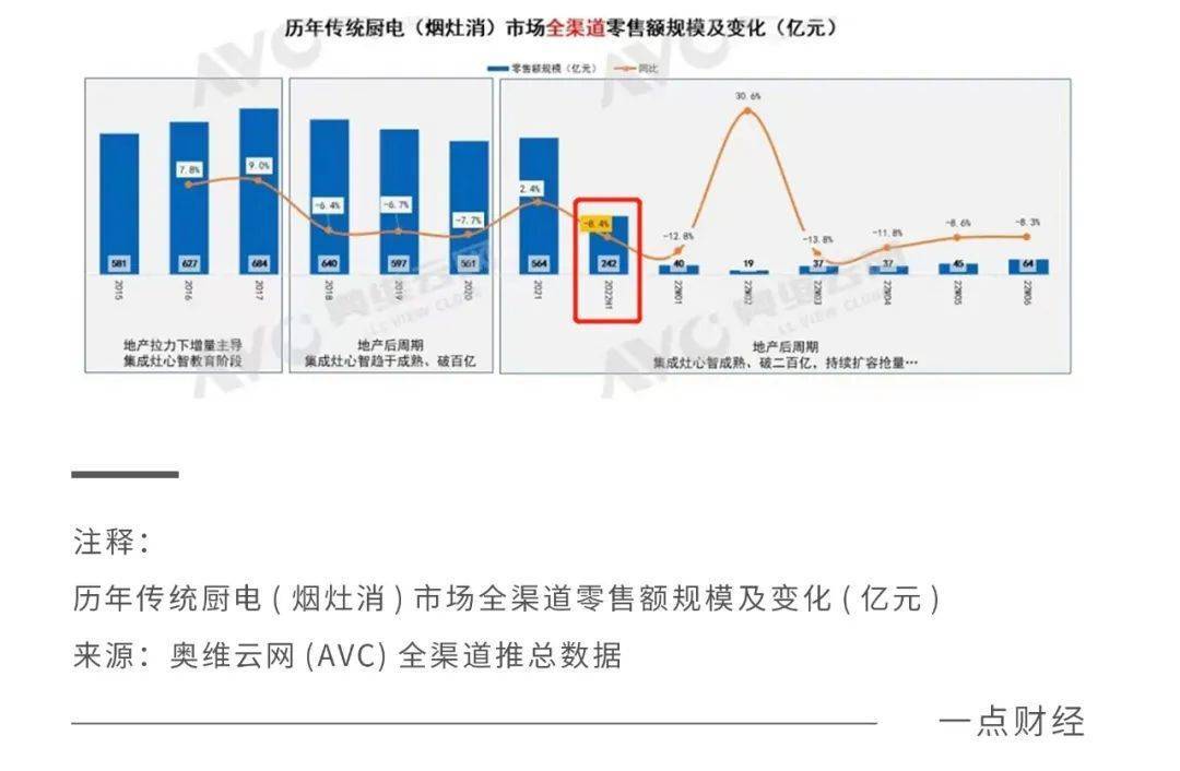根据奥维云网(AVC)数据,今年上半年厨热市场(烟灶消洗嵌集热)整体规模676亿元,同比下滑6.7%;传统厨电(烟灶消)零售额242亿元,同比下滑8.4%。
