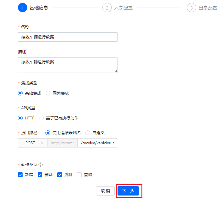 在创建执行动作界面,设置执行动作名称、接口路径、动作类型和接口路径基本信息,然后单击下一步。