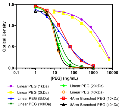 聚(乙二醇)(PEG)是药物输送系统中广泛使用的聚合物,通常直接与药物治疗剂结合。药物治疗剂的聚乙二醇化是合乎需要的,因为已经发现它可以增加保留时间、降低免疫原性并增加对代谢酶的稳定性。聚乙二醇化蛋白质 ELISA 试剂盒适用于药物开发和药物制造应用,包括药物配方、药代动力学分析、药物比较、先导候选物鉴定、批次放行标准和过程中 QC 研究。目前,还没有长期研究揭示这种聚合物在体内的命运。已经确定需要进行毒理学研究来确定代谢的聚乙二醇化治疗剂在各种组织中的积累。