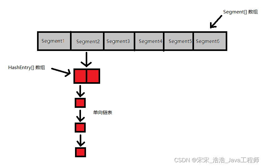 在 JDK1.7中,本质上还是采用链表+数组的形式存储键值对的。但是,为了提高并发,把原来的整个 table 划分为 n 个 Segment 。所以,从整体来看,它是一个由 Segment 组成的数组。然后,每个 Segment 里边是由 HashEntry 组成的数组,每个 HashEntry之间又可以形成链表。我们可以把每个 Segment 看成是一个小的 HashMap,其内部结构和 HashMap 是一模一样的。