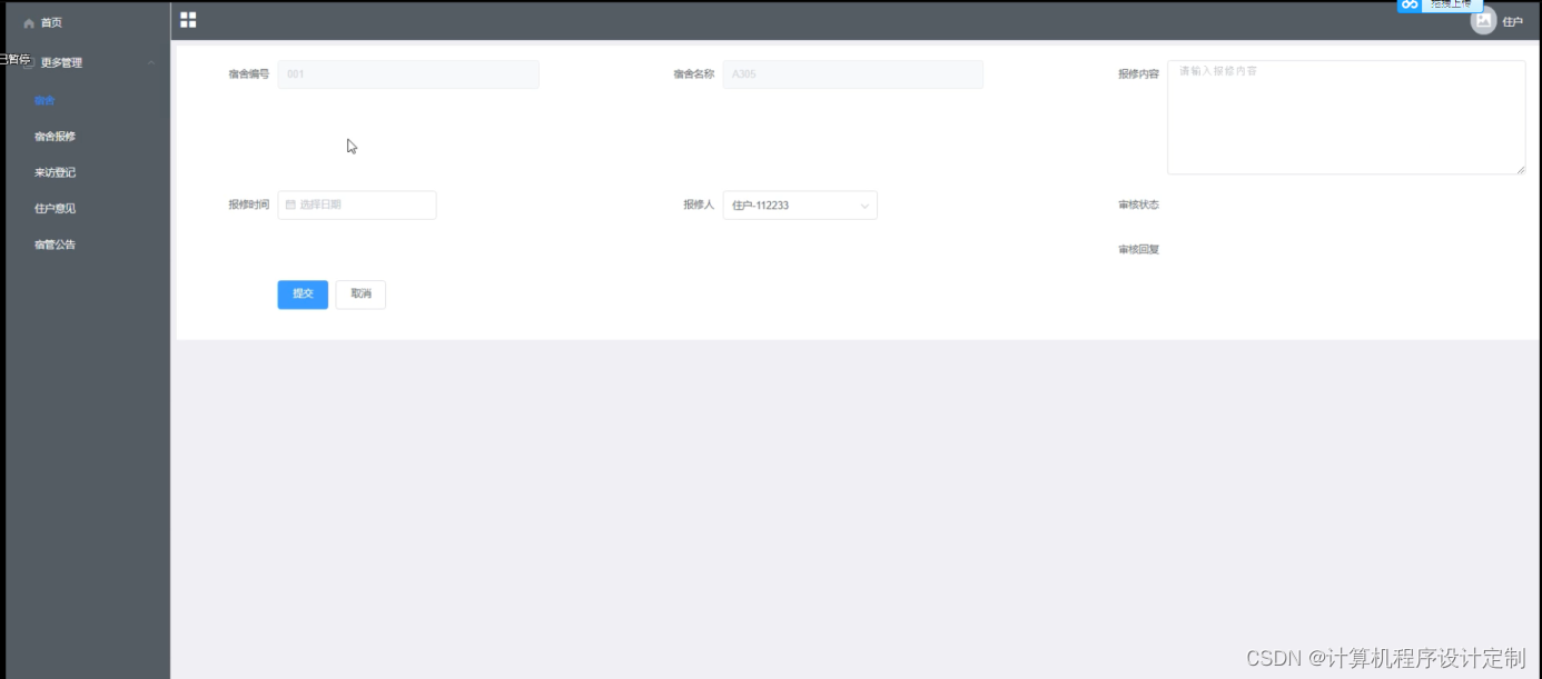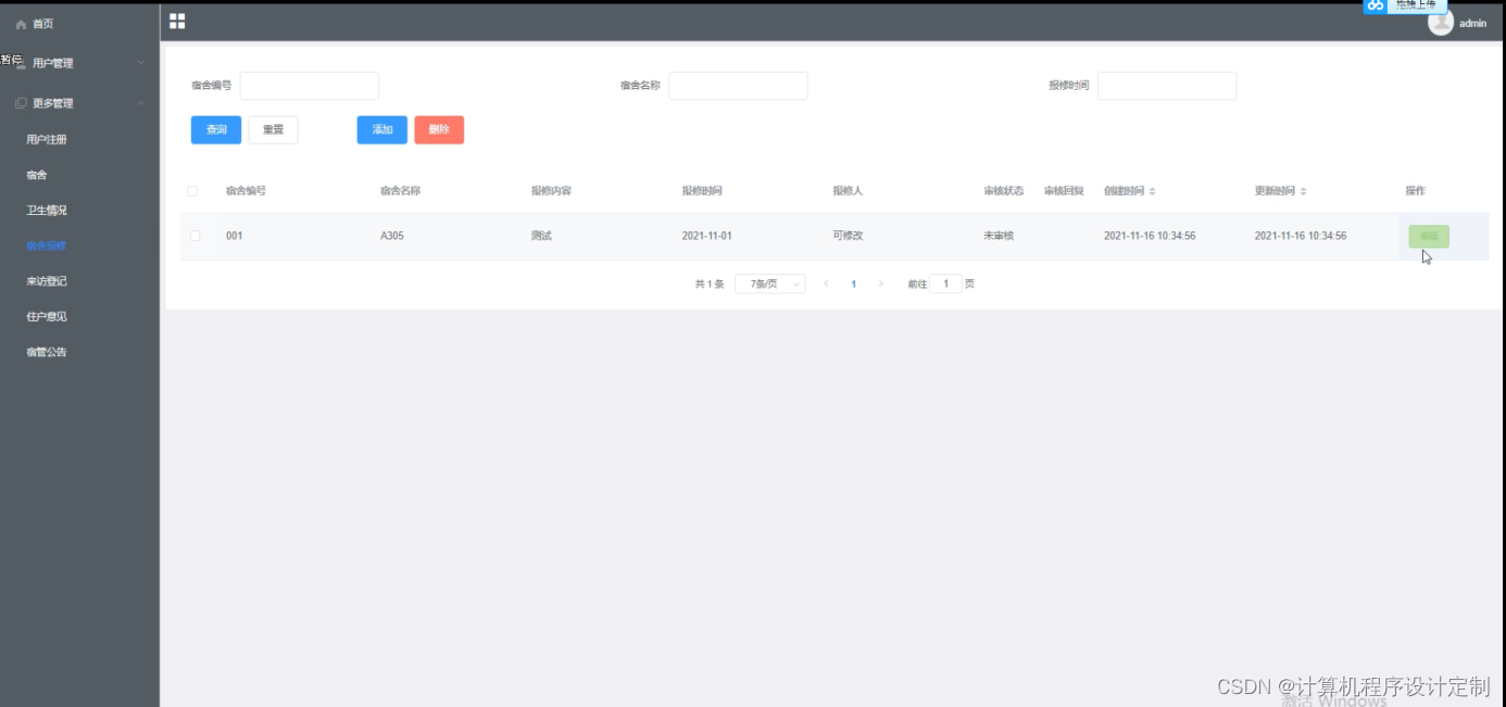 修改宿舍报修信息时,选择需要修改的宿舍报修进行修改,调用业务层的editSushe方法,拿到该宿舍原本的信息并显示到页面,管理员再对需要修改的宿舍报修信息字段进行修改,完成后调用addSushe方法,调用业务层的updateByKey方法,更新数据库的宿舍报修表的数据。
