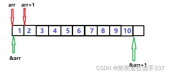 我们可以看到,arr+1跳过了4个字节,也就是1个int类型元素所占的空间大小,&arr+1跳过了40个字节,也就是10个int类型元素所在的空间大小。arr+1跳过了数组的一个元素,而&arr+1跳过了整个数组。