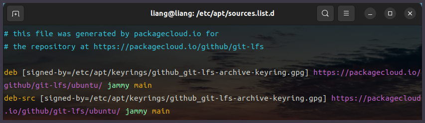 如下图所示,在/etc/apt/sources.list.d/目录下就多了github_git-lfs.list文件:
