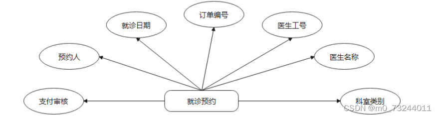 挂号预约:存储用户的挂号预约信息。包括挂号预约的订单编号、医生工号、医生名称、科室类别、挂号日期时间、预约人、是否支付、是否审核、审核回复等数据项。
