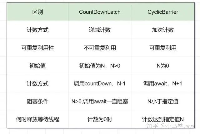 ❝ CountDownLatch:假设老师跟同学约定周末在公园门口集合,等人齐了再发门票。那么,发门票(这个主线程),需要等各位同学都到齐(多个其他线程都完成),才能执行。CyclicBarrier:多名短跑运动员要开始田径比赛,只有等所有运动员准备好,裁判才会鸣枪开始,这时候所有的运动员才会疾步如飞。 ❞