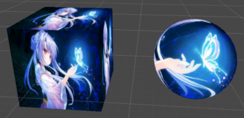 将该 Material 拖拽到一个 Cube 和 Sphere 游戏对象上。选中绑定的 Material,在 Inspector 窗口调整 Shader 中固定颜色,显示效果如下: