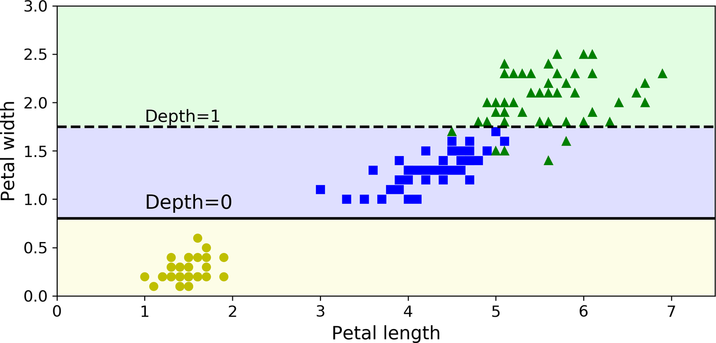 图 6-2显示了此决策树的决策边界。粗竖线表示根节点的决策边界(深度 0):花瓣长度 = 2.45 cm。由于左侧区域是纯的(仅Iris setosa),因此无法进一步分割。但是,右侧区域是不纯的,因此深度为 1 的右侧节点将其拆分为花瓣宽度 = 1.75 厘米(由虚线表示)。由于max_depth设置为 2,决策树就停在那里。如果设置max_depth为 3,则两个深度为 2 的节点将各自添加另一个决策边界(由虚线表示)。