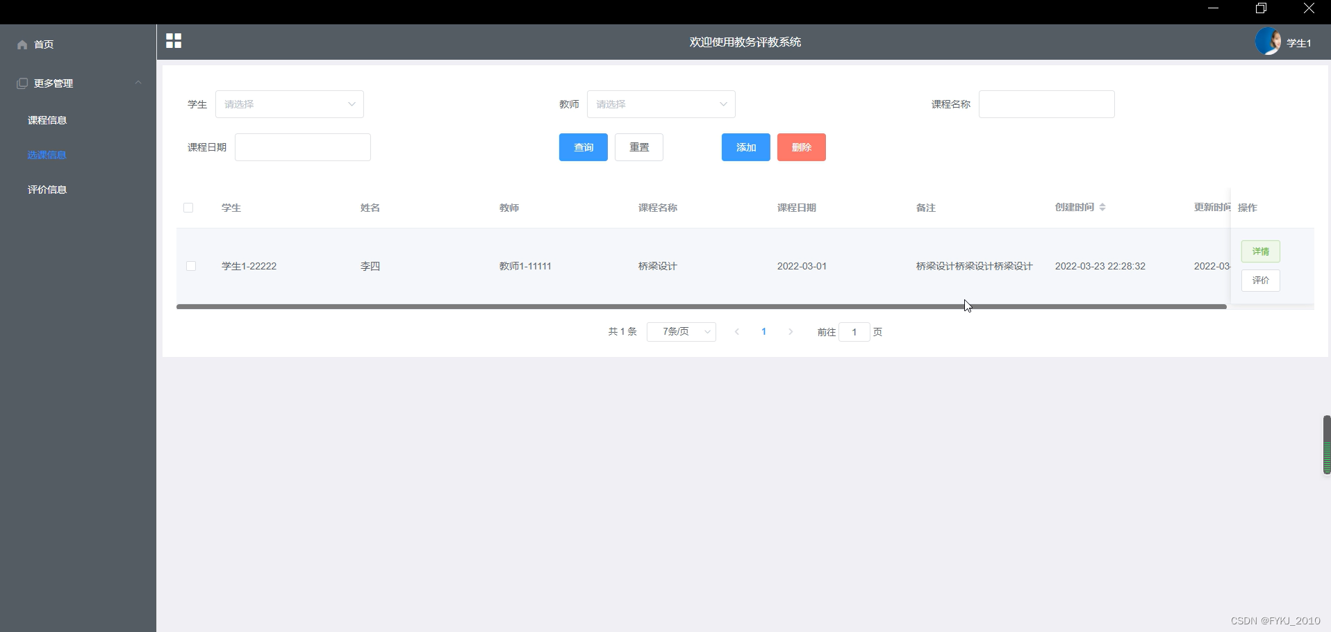 课程评价管理,在课程评价管理页面列表可查询评价信息:课程编号、课程名称、教师工号、教师姓名、学号、学生姓名、学生建议、添加时间等内容,还可在该页面进行编辑删除详细等操作,如5-8