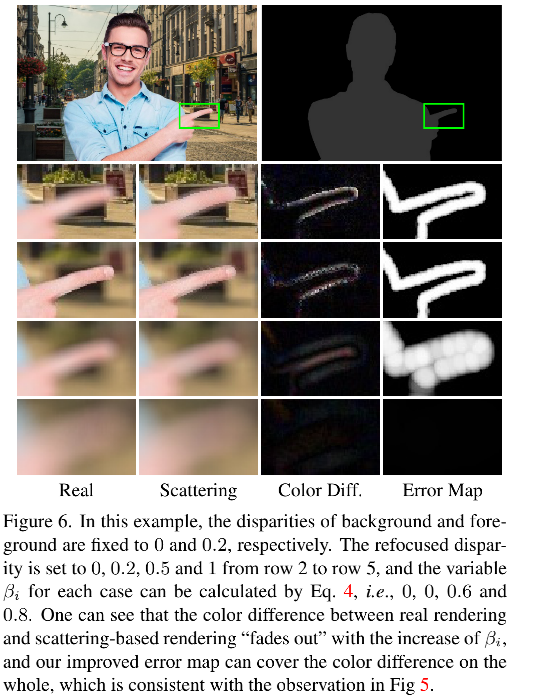 经典渲染器。我们期望经典渲染器在深度连续区域渲染真实的虚化效果。在对比了不同的方法后,我们发现基于散射的逐像素渲染方法[23,31]在深度不连续处也会有严重的渗色伪影,但在这些区域的误差相对较小。该方法的核心思想是将每个像素分散到其相邻区域,它们之间的距离小于像素的模糊半径。 如 [31, 38] 中所讨论的,给定像素的视差 d,其模糊半径可以通过下式计算: