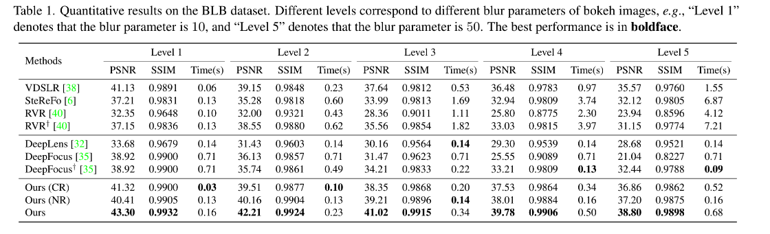 遵循[6,35,37],采用 PSNR 和 SSIM 作为评价指标。我们在 BLB 数据集上测试 BokehMe。正如 Table1 所示,与其他最先进的方法相比,BokehMe在所有模糊级别中都获得了最佳的PSNR和SSIM分数,并且我们的最终模型结合了经典渲染器和神经渲染器,优于单独的模型,证明了两个渲染器之间的强大互补性。此外,随着模糊程度的提高,经典的渲染方法变得更加耗时,而神经渲染方法则保持了高效率。我们还在图 10 中显示了一些视觉结果。人们可以观察到:(i)当重新聚焦背景时,经典方法的性能在深度不连续性时会下降;(ii) DeepLens在深度不连续处呈现平滑的结果,但它们似乎与实际渲染不符;(iii) 与DeepFocus相比,DeepFocus†避免了在处理大模糊尺寸时的损坏,但在对焦区域周围会产生模糊的结果。(iv)我们的方法为信息焦点和失焦区域呈现最逼真的虚化效果。