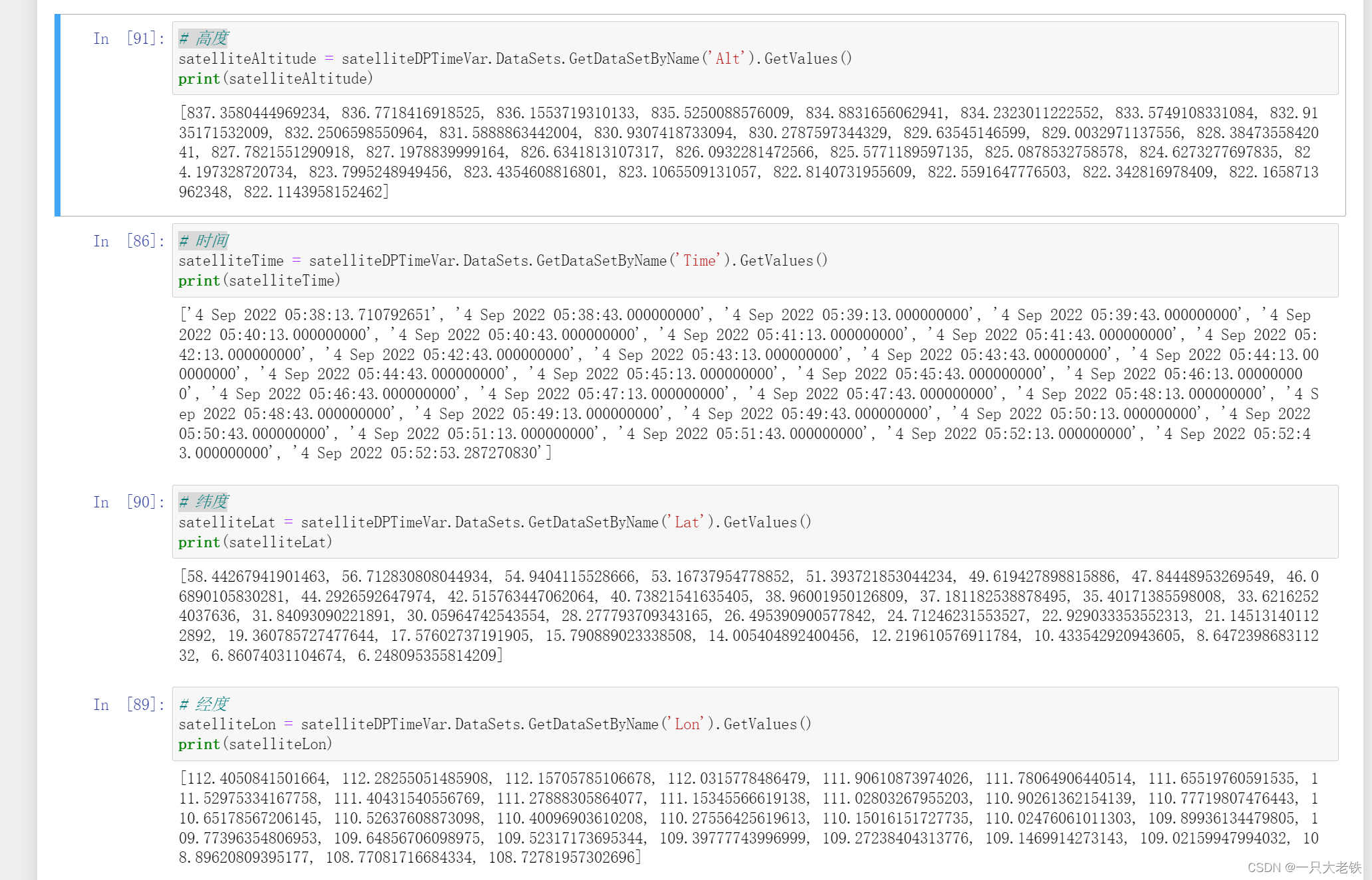satelliteDP2.ExecElements 这个函数的第一个参数是你要采集的哪一段访问时间的开始,第二参数是访问时间的结束,然后第三个参数“30“ 表示间隔多久采集一次,30表示每30秒采集一次,最后的rptElements表示要获取的参数