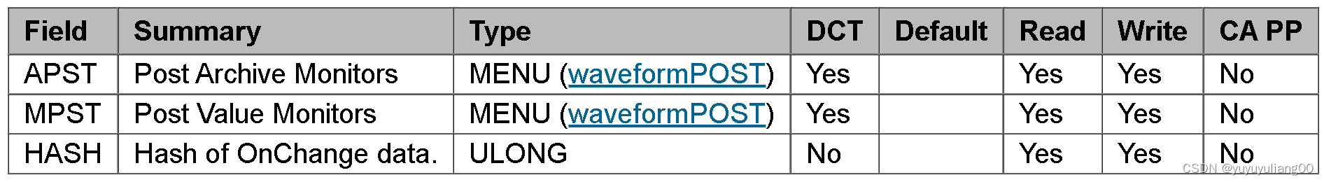 这些参数用于确定何时发送在VAL字段上的monitors。APST和MPST字段有一个带有选项Always和On Change的菜单。默认是Always,因而通常在这个记录每次运行时发送monitors。选择On Change,使得在记录每次运行时要计算一个VAL字段缓存的32位哈希值并且与线圈哈希值做比较;只在哈希不同时,才发送monitors,表明缓存已经变化。注意:有这样的小可能性,不同值缓存产生相同的哈希值,因此,对于关键系统,Always可能是更好的选择,即使它再次发送重复的数据。