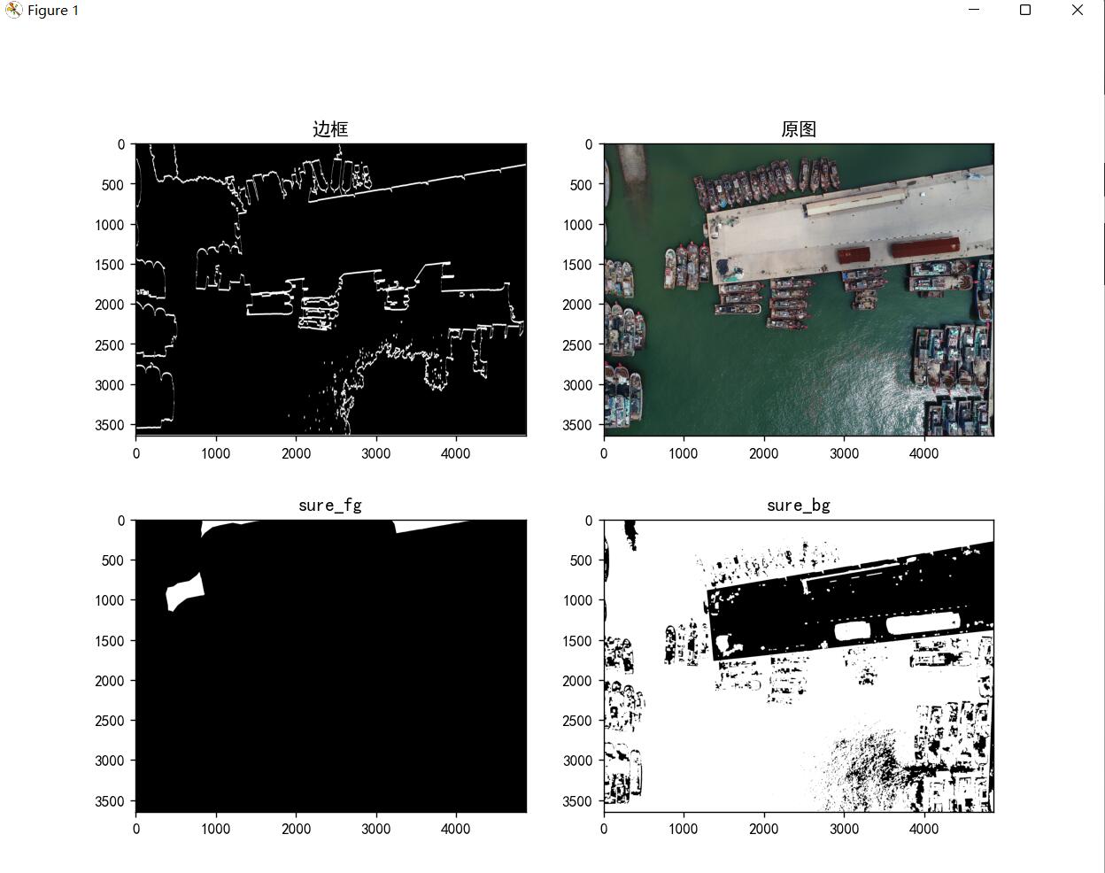 37. unknown = cv.subtract(sure_bg, sure_fg) # 从sure_bg区域中减去sure_fg区域来获得unknown