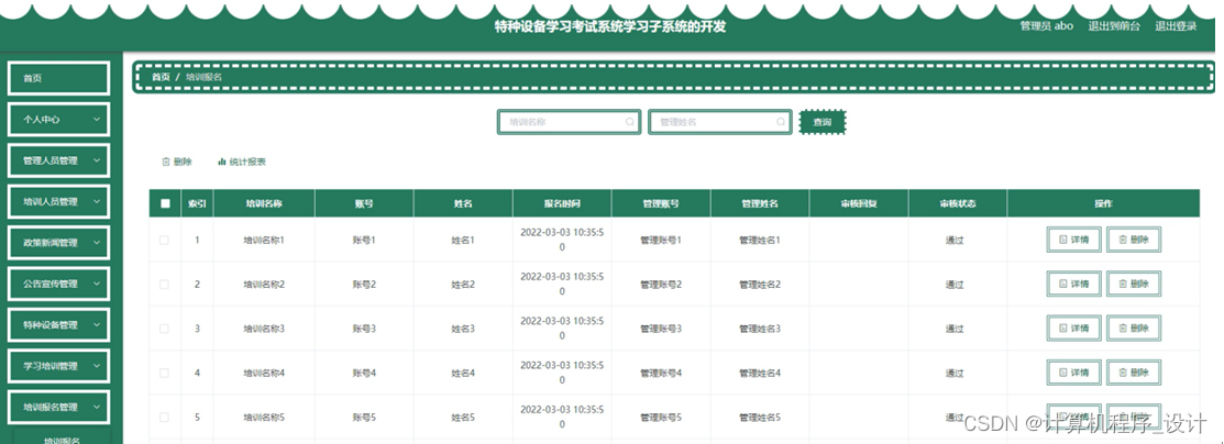 后台主要是管理员,管理员功能包括首页,个人中心,管理人员管理,培训人员管理,政策新闻管理,公告宣传管理,特种设备管理,学习培训管理,培训报名管理,试卷管理,试题管理,系统管理,考试管理等;