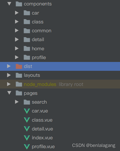 pages 当中是页面组件 此项目有六个主要页面 搜索页面、购物车页面、分类页面、首页、个人中中心、首页