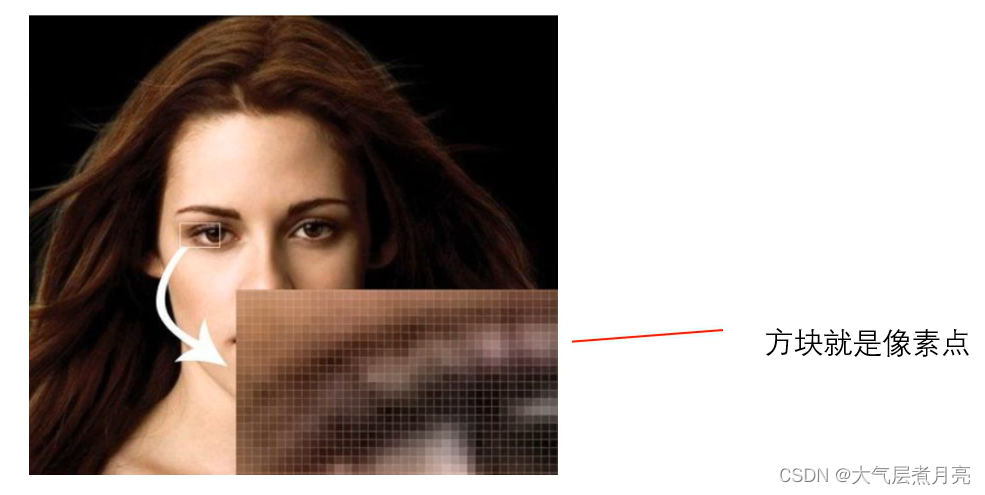 当我们把上面这个模特的眼睛不断的放大,放大到像素级别之后就如上图右下角所示,我们可以很明显的看到图片变成了一个个方格块组成的矩形,这就是图像的本质,而这些方块就是像素点。
