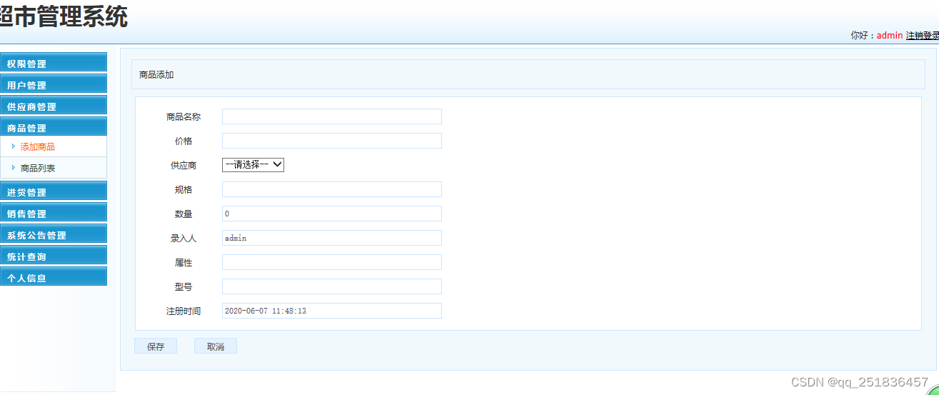 JSP 超市管理系统是一套完善的web设计系统,对理解JSP java编程开发语言有帮助,系统具有完整的源代码和数据库 ,系统主要采用B/S模式开发。开发环境为TOMCAT7.0,Myeclipse8.5开