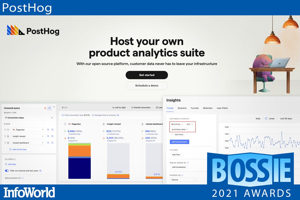 is an easy-to-use instrumentation framework for product analytics, offering a fast path to gaining insight into user behavior of your web and mobile apps. Just add a small JavaScript snippet to your code and you’re off and running. PostHog’s auto-capture collects the deluge of front-end interaction events that fire off during a user session. A point-and-click, menu-driven UI makes easy work of distilling that flood of event data into meaningful action metrics, trend charts, and bite-sized dashboards. Funnels help you refine compound usage patterns even further to isolate bottlenecks and improve bounce rates. Available for on-prem deployment or in a SaaS offering, PostHog takes the tedium and guesswork out of optimizing the user experience of your software products.