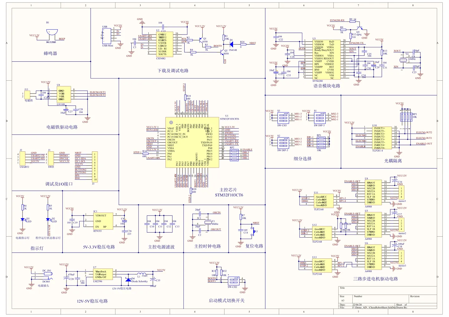 其中主控使用的是STM32F103C8T6,机械臂采用42步进电机驱动,驱动器是A4988,主控与驱动器之间使用光耦隔离。机械臂末端电磁铁使用一个H桥驱动,语音模块使用的是SYN6288,可通过串口接收文字,解码后播放语音。