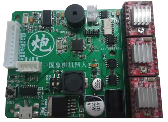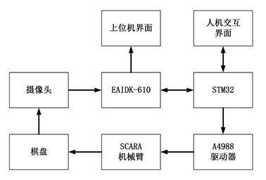 基于EAIDK-610的中国象棋机器人对弈系统由桌面式机械臂、磁性棋盘及棋子、STM32下位机控制系统、 EAIDK-610 开发套件组成。当用户走棋完成后,EAIDK-610通过摄像头采集棋局图像,获取玩家的走棋路线,并运行Elephantfish象棋搜索算法计算一步最优应对策略,下位机通过逆运动解算及梯形加减速算法控制机械臂快速移动棋子,完成一次对弈过程,并给予相应的语音提示。目前机器人已经实现了常规开局、残局对弈及语音提示功能,正在加入机器摆棋、棋局破解、语音对话等功能。该机器人体积小巧、响应速度快,功能丰富,用户体验将远远优于象棋软件及同类型的棋类机器人。