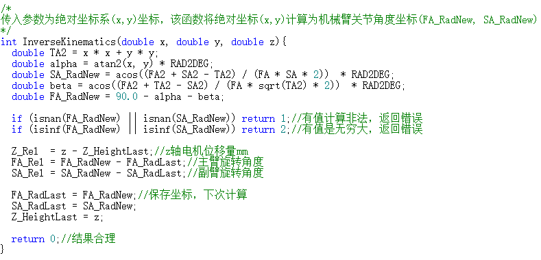 SCARA机械臂为三轴,正运动指的是已知每个轴的角度,这时候机械臂的姿态就唯一确定了,其末端执行器的xyz坐标也确定了。在象棋对弈过程中需要控制机械臂移动到棋盘的某个坐标,逆运动解算就是根据输入的xyz坐标计算出机械臂每个轴的角度。