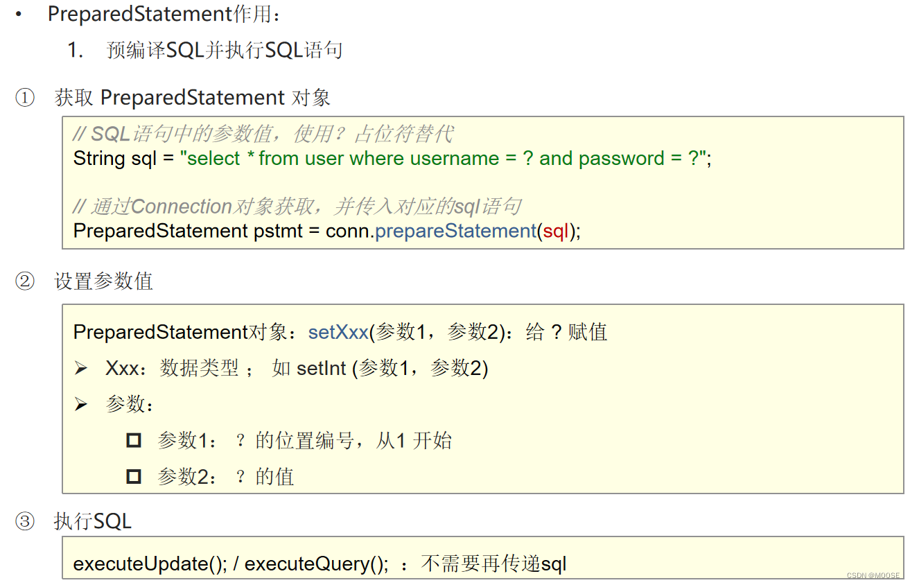 作用:预编译SQL语句并执行:预防SQL注入问题