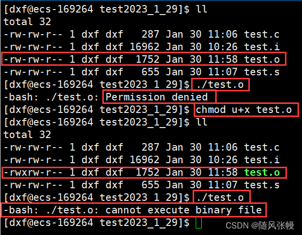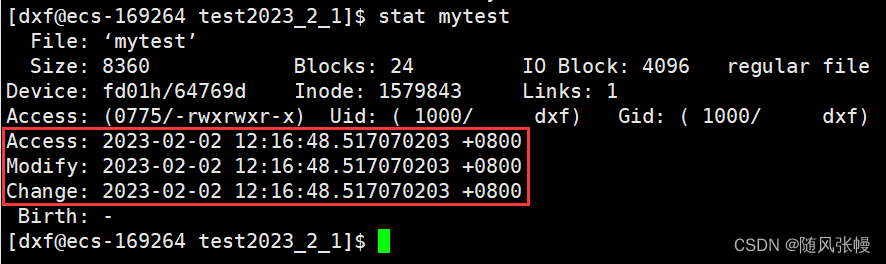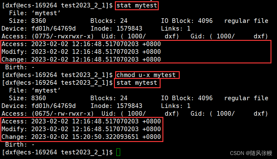 如下图所示,将mytest文件所有者的运行权限关闭,也就是修改了文件的属性,此时stat mytest可以看到文件的Change部分时间改变了而文件的Access、Modify部分时间没有改变。