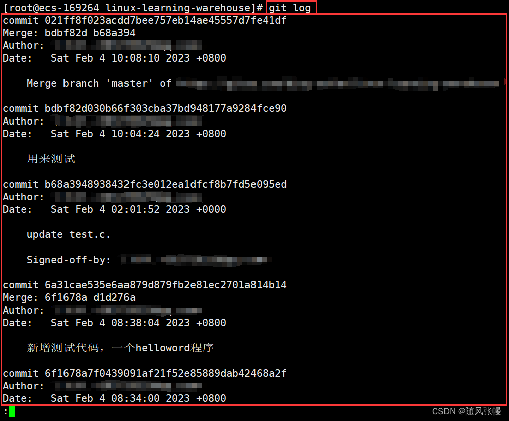 3.使用git log命令可以看到git日志,git日志中存储着所链接仓库的所有提交记录,如下图所示。