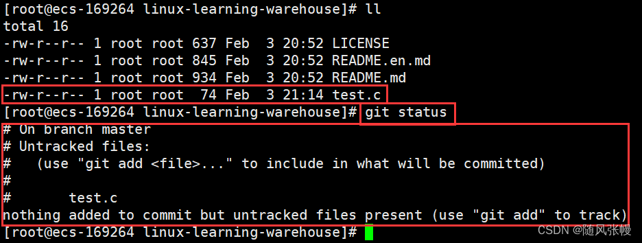 使用git status命令可以查看本地仓库和远端仓库之间的关系,如下图所示,系统提示有一个没有被管理的文件test.c。