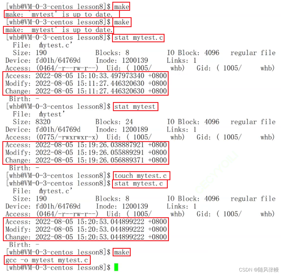 如下图所示,此时mytest可执行文件的时间在test.c文件Modify部分时间之后,那么mytest就是新的,此时进行make指令系统不会对mytest.c重新进行编译。使用touch命令更新mytest.c文件的时间戳,touch命令可以创建文件也可以重新更新文件的时间戳,那么在进行make指令系统就会对mytest.c重新进行编译。