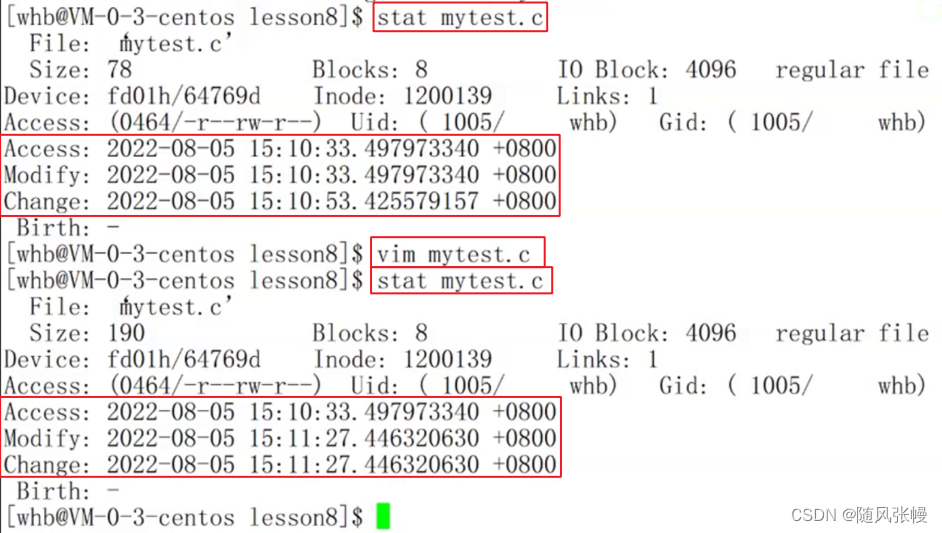 如下图所示,打开mytest.c文件修改一些代码,也就是修改了文件的内容,此时stat mytest可以看到文件的Change、Modify部分时间改变了而文件的Access部分时间没有改变。