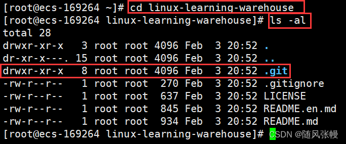 此时在当前目录下使用ll命令,我们就可以看到新增了一个以gitee仓库名为名称的目录,如下图一所示,进入该目录,使用ls -al命令,我们可以看到新增了一个.git隐藏文件,如下图二所示,这里的.git文件就是本地的git仓库,我们将代码同步到gitee远端其实就是将这里本地git仓库与远端进行同步。