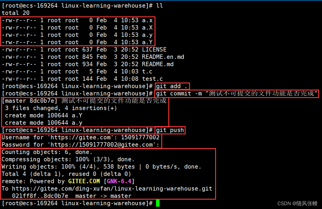 如果有不想提交到远端的一类文件,将该类文件的后缀添加到该.gitignore文件中即可,如下图三所示,我们添加了.X和.x后缀。此时我们创建a.x、a.X、a.y、a.Y四个文件,如下图四所示,使用三板斧命令git add .、git commit -m "测试不可提交的文件功能是否完成"、git push将这四个文件尝试提交到远端,如下图五所示,其中git add .是将所有没有提交到远端的文件全部进行提交,细心的话可以看到这里在commit的时候后缀为.x和.X的文件没有进入本地git仓库。如下图六所示,在远端的gitee仓库中,后缀.y和.Y的文件成功上传而后缀.x和.X的文件没有上传。